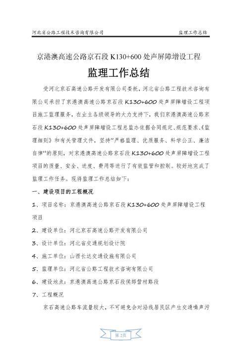 K130+600 處聲 屏障增設(shè)工程監(jiān)理報告