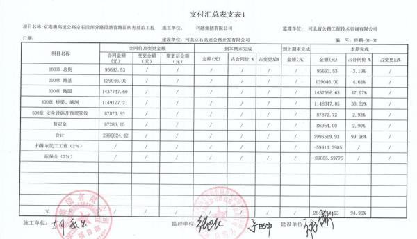 京港澳高速公路京石段部分瀝青路面病害處治工程支付證書