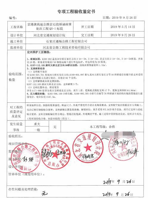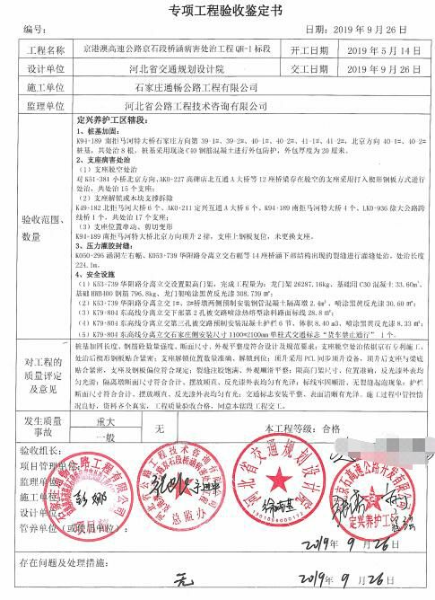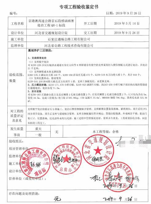 京港澳高速公路京石段橋涵病害處治工程QH-1標段工程專項鑒定書