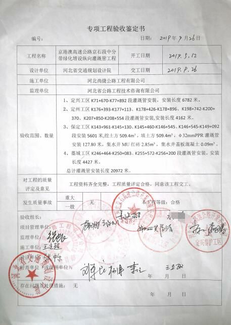 京港澳高速公路京石段中分帶綠化增設(shè)縱向灌溉管工程專項鑒定書