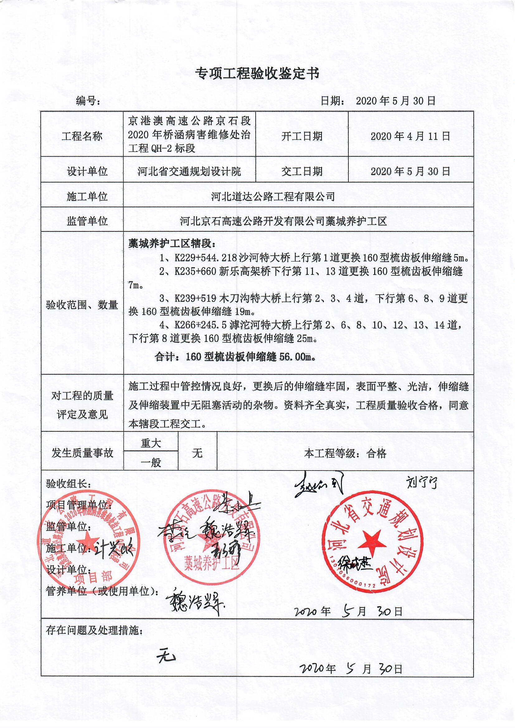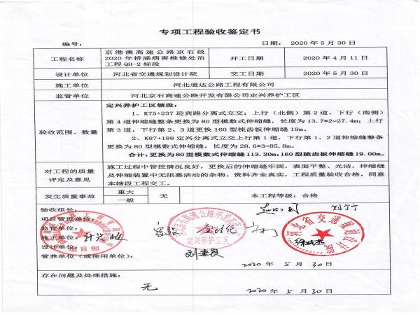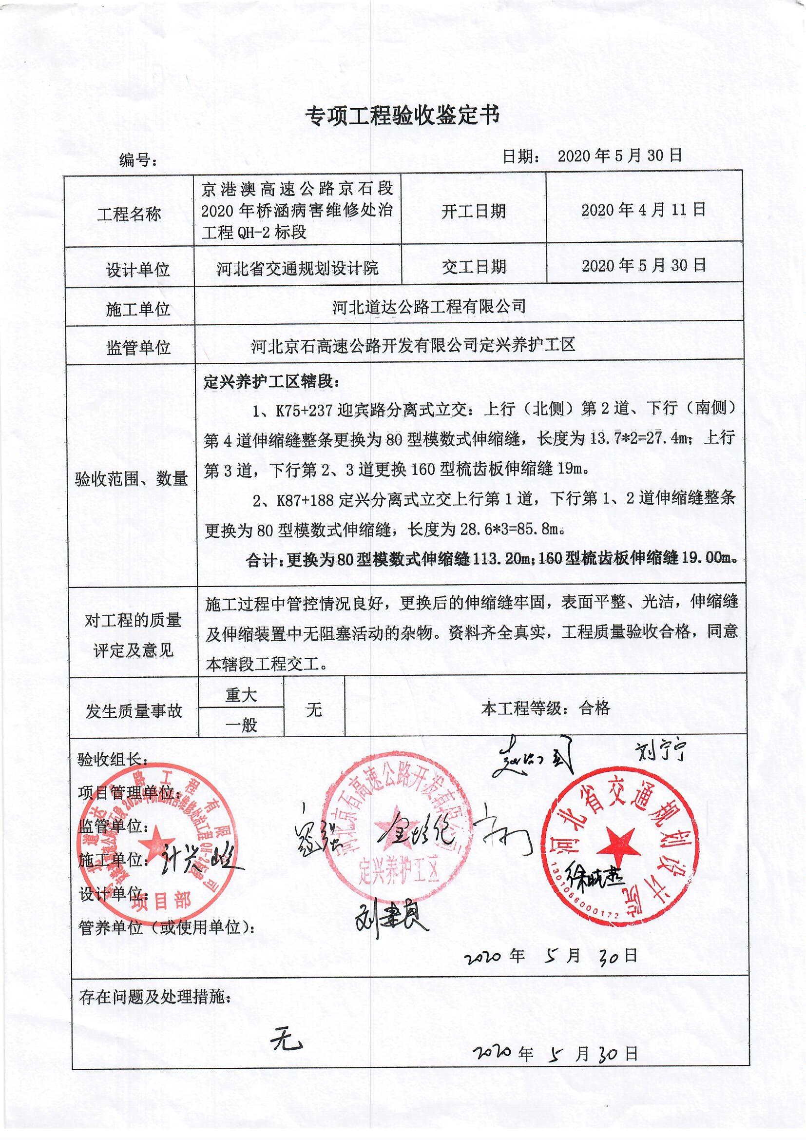 京港澳高速公路京石段2020年橋涵病害處治工程QH-2標(biāo)段驗(yàn)收證書(shū)