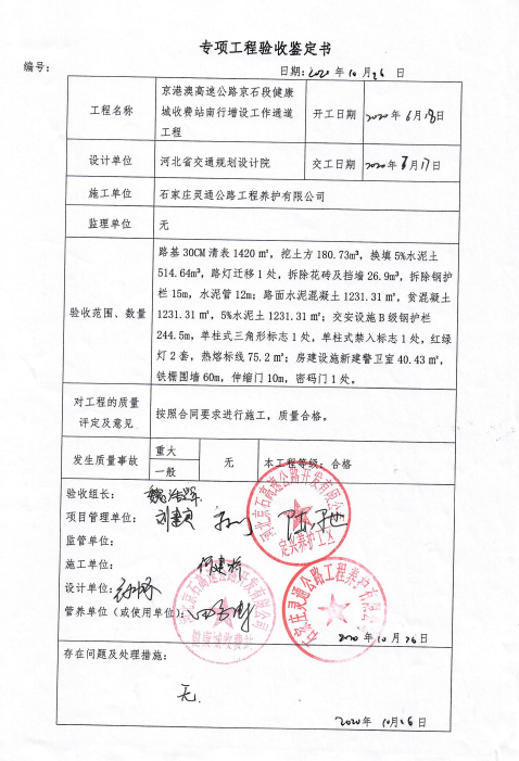 京港澳高速公路京石段健康城收費站南行增設(shè)工作通道工程驗收鑒定書
