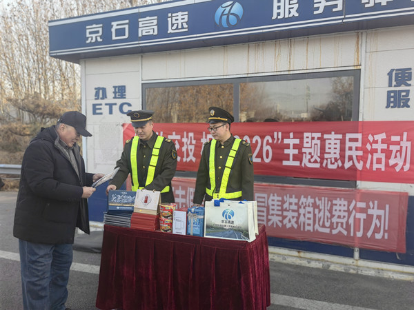 工作人員在收費站口設置便民服務臺,為司乘免費提供方便面、毛巾,還精心準備了2026年臺歷伴手禮,同時現(xiàn)場引導司乘注冊“冀交萬里行”“京石易行”會員,將新年祝福與溫暖傳遞給每一位過往司乘。