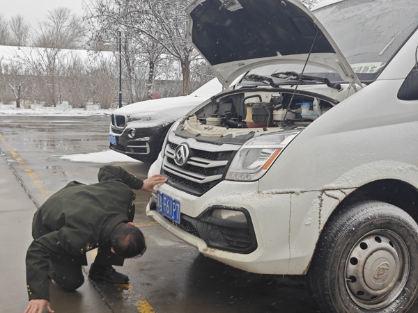 “雪天行車,安全一點(diǎn)不能馬虎?!避囕v管理員李勇半跪在積雪里,對(duì)班車進(jìn)行出發(fā)前檢查。他手持強(qiáng)光電筒仔細(xì)敲擊輪胎、察看底盤。檢查完最后一輛車,他的膝蓋處已是一片濕濘,卻保障了車輛安全。